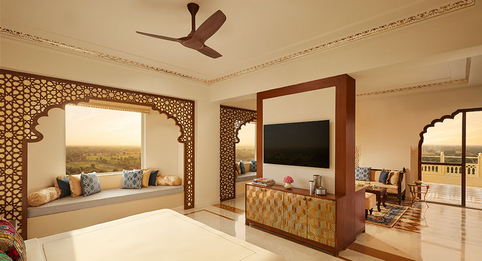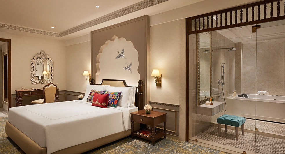 Our spacious rooms and suites combine old-world elegance with every modern comfort. Each features large windows providing ample natural light and elegant furnishings, with the highest-quality linens and luxurious amenities ensuring every moment is exceptional. Settle in for an unforgettable Jaipur stay with every need taken care of.