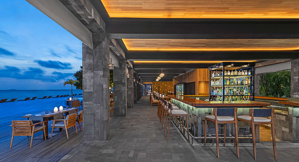 There are six restaurants and bars at Anantara Kihavah Maldives Villas, as well as private and in-villa dining.