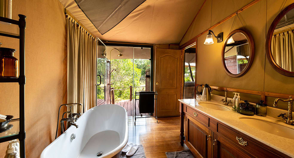The tents themselves are a perfect blend of comfort and nostalgia. Eleven double tents and four twin tents, each an impressive 49 sqm, offer ample space to unwind after a day of adventure. For families or those seeking extra room, the camp features a generous 87 sqm family tent, complete with two en suite bedrooms connected by a central lounge area – the ideal setup for shared experiences and private retreats.