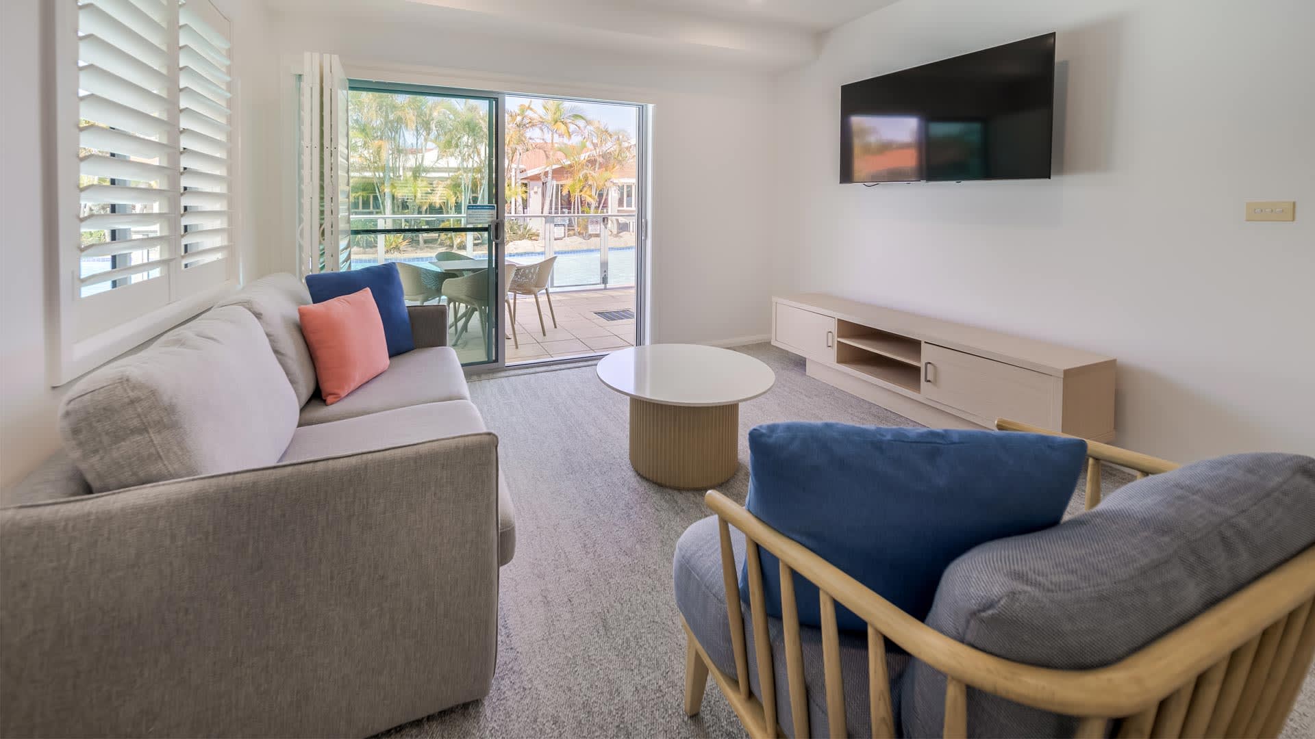 At Oaks Port Stephens Pacific Blue Resort, we offer a variety of accommodations tailored to families, couples, and groups of all sizes. Choose from studio rooms to spacious one, two, and three-bedroom apartments, all featuring contemporary amenities. Each room includes a kitchenette or fully equipped kitchens, with laundry facilities for added convenience during extended stays. Unwind on your private balcony or patio, where you can take in breathtaking views after a day of exploration. For those seeking a bit more luxury, opt for a room with swim-out access, a private spa, or a plunge pool. Our diverse selection of rooms ensures a comfortable and memorable stay, whether you're here for relaxation or adventure.