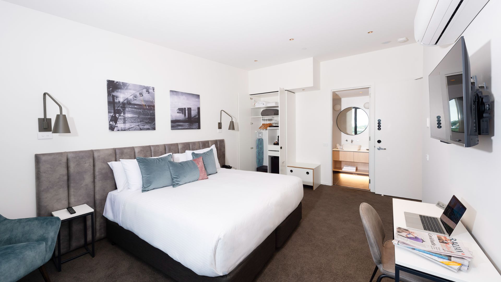 At Oaks R Suites Geelong, choose from a range of modern hotel rooms, 1 and 2 bedroom apartments designed for your convenience and comfort. Our apartments feature private balconies with stunning bay or city views so you can enjoy the scenic beauty of Geelong. You’ll feel at home in our rooms with fully equipped kitchens, laundry facilities, and Wi-Fi inclusive, ensuring you have everything you need for a relaxing stay.