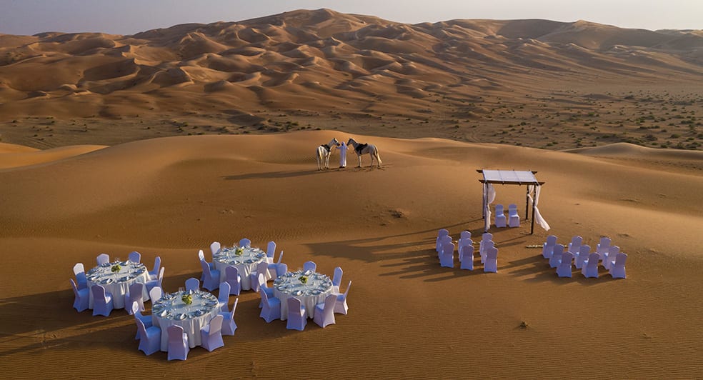 No scenery is more captivating than the desert ablaze at sunset, the perfect backdrop for your exchange of vows. Say 'I do', then entertain your guests in a private villa, our elegant ballroom, or out in our Bedouin campsite. Each space can be decorated as you please, with a dedicated events team to bring your vision to life. The Royal Pavilion villas, located half a kilometre from the main resort, can also be reserved in their entirety to host your wedding party.